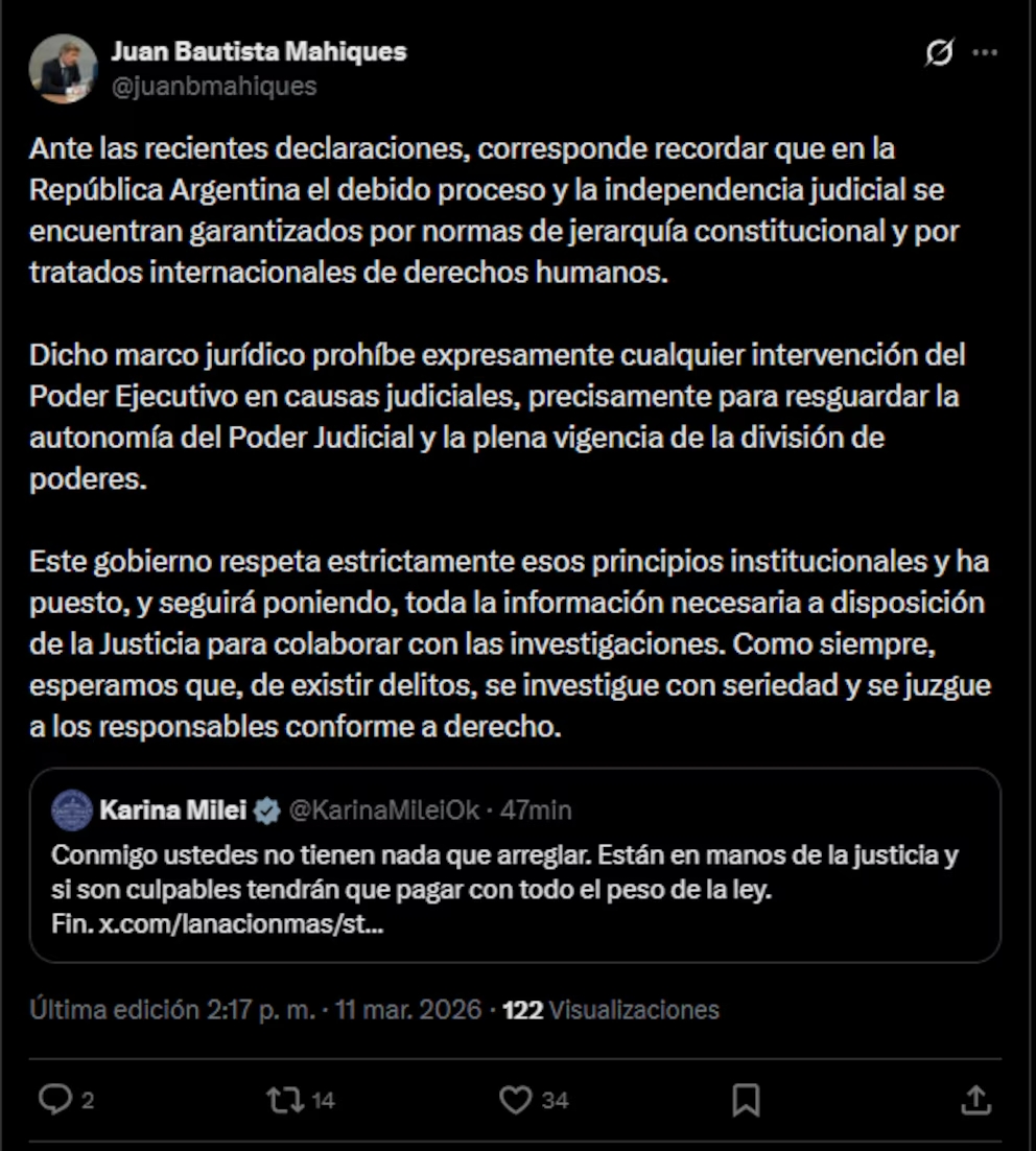 Tras el posteo de la secretaria general, el ministro de Justicia, Juan Bautista Mahiques, reforzó la línea discursiva del Gobierno. El funcionario subrayó que el debido proceso y la independencia judicial están garantizados por normas constitucionales y tratados internacionales que prohíben expresamente la intervención del Ejecutivo en causas judiciales. Mahiques fue enfático al señalar que el Estado seguirá poniendo toda la información a disposición de la Justicia para colaborar con la investigación de los presuntos delitos.