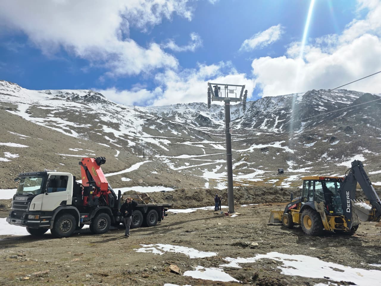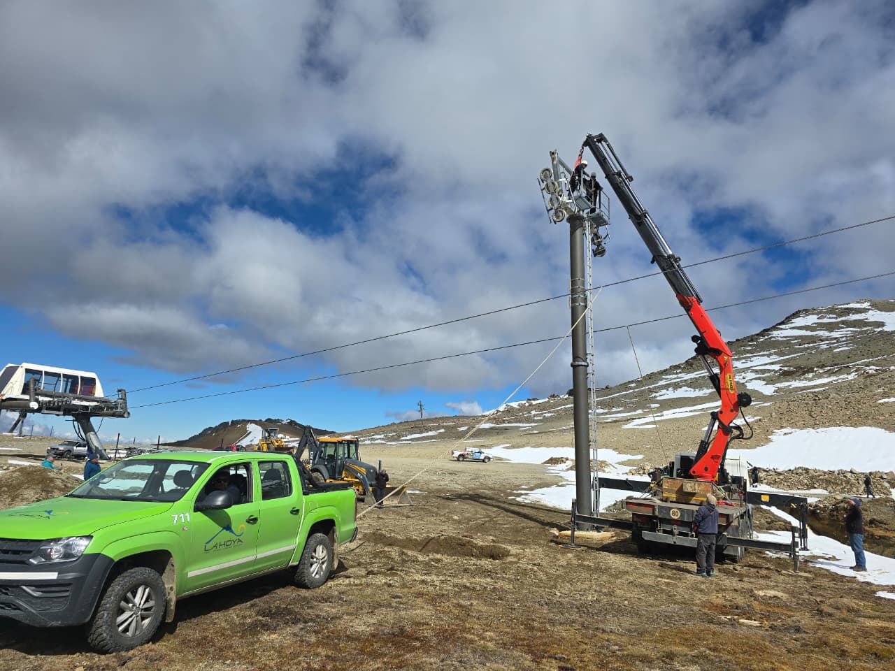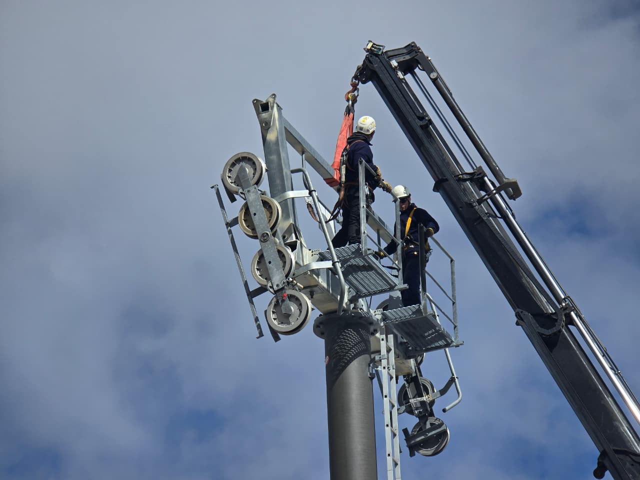 Para su ejecución se trasladó una grúa especialmente a Esquel. Esta intervención, a cargo de un equipo técnico especializado en trabajos en altura, forma parte de las labores que habitualmente no son visibles para el público, pero que resultan esenciales para garantizar el correcto y seguro funcionamiento de los medios de elevación.