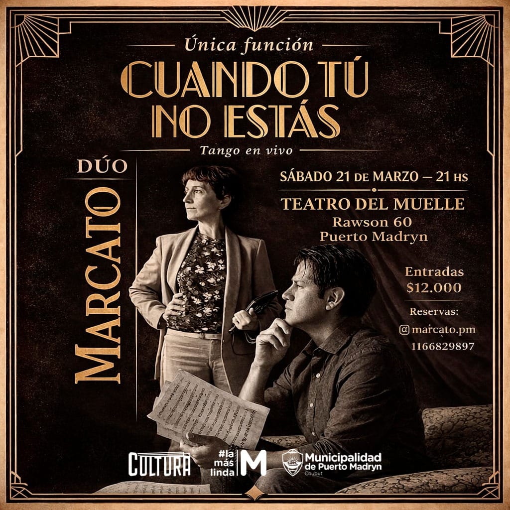 La Municipalidad de Puerto Madryn, a través de la Subsecretaría de Cultura, invita a la comunidad a la presentación del dúo Marcato, que tendrá lugar el sábado 21 de marzo a las 21 horas en el Teatro del Muelle, ubicado en Avenida Rawson 60. El espectáculo, titulado “Cuando tú no estás”, propone un recorrido musical por tangos, valses y milongas interpretados por Jesús Olguera en piano y Marina Richeri en voz.