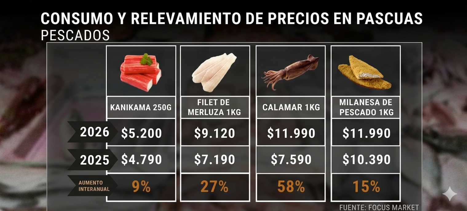El consumo de pescado, motorizado por la tradición religiosa, muestra variaciones que oscilan entre el 9% y el 58%. El dato positivo para el bolsillo de los consumidores es que productos de alta demanda, como el filet de merluza, las milanesas de pescado y el kanikama, han mostrado ajustes inferiores a la inflación general.