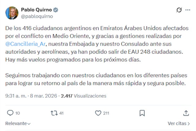“De los 416 ciudadanos argentinos en Emiratos Árabes Unidos afectados por el conflicto en Medio Oriente, y gracias a gestiones realizadas por @Cancilleria_Ar, nuestra Embajada y nuestro Consulado ante sus autoridades y aerolíneas, ya han podido salir de EAU 248 ciudadanos. Hay más vuelos programados para los próximos días. Seguimos trabajando con nuestros ciudadanos en los diferentes países para lograr su retorno al país de la manera más rápida y segura posible”, posteó Quirno esta mañana en su cuenta de X.