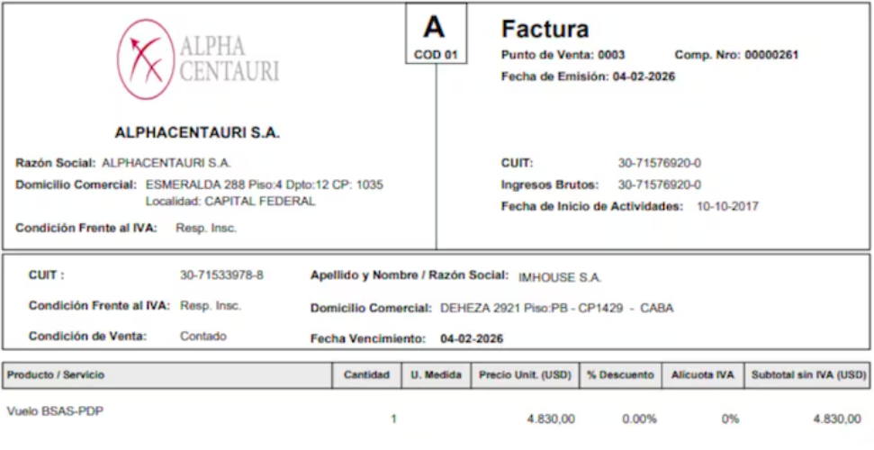 El recibo, que fue incorporado al expediente, informa la compra de un paquete de 10 vuelos por un total de 42.250 dólares a la firma Alpha Centauri S.A. Uno de esos tramos, cuyo valor sería 4.250 dólares, fue utilizado por la familia del vocero el 17 de febrero.