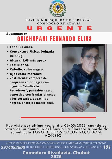 La Policía del Chubut mantiene activo un Alerta de Búsqueda para dar con el paradero de Fernando Elías Güichapani, de 53 años, quien fue visto por última vez el pasado jueves 6 de marzo en el barrio La Floresta de Comodoro Rivadavia. Según Adnsur, a tres días de su desaparición, la División Búsqueda de Personas intensifica los rastrillajes sin resultados positivos hasta el momento.