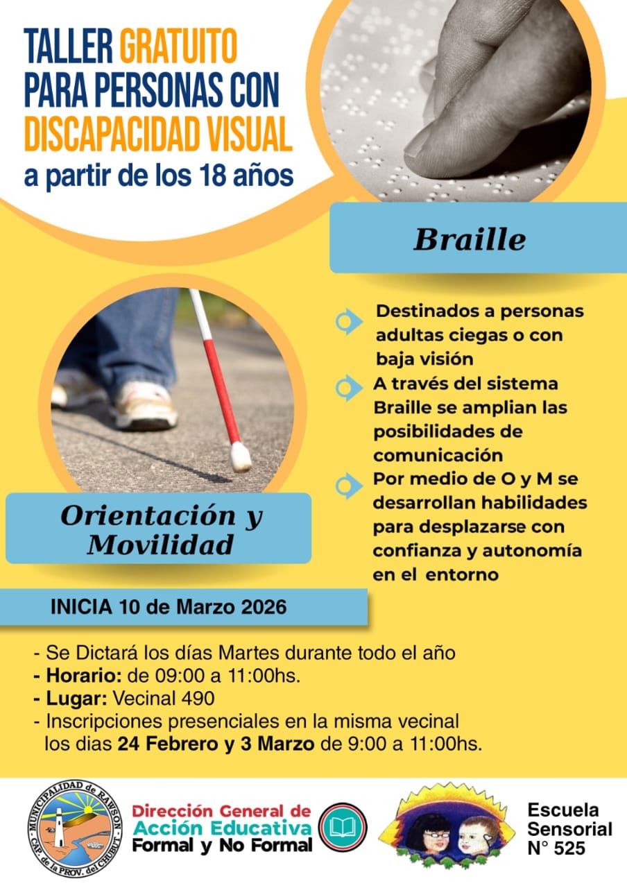 El Taller de Braille, Orientación y Movilidad para personas con discapacidad visual mayores de 18 años se desarrolla en el Centro Comunitario del barrio 490 Viviendas, con gran participación. La Municipalidad de Rawson, en coordinación con la Escuela Especial Sensorial N° 525, informó que los cupos siguen disponibles.