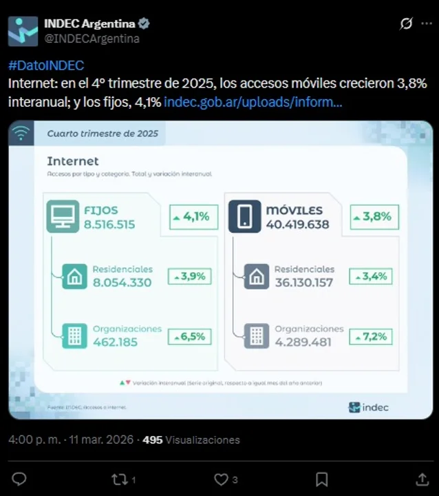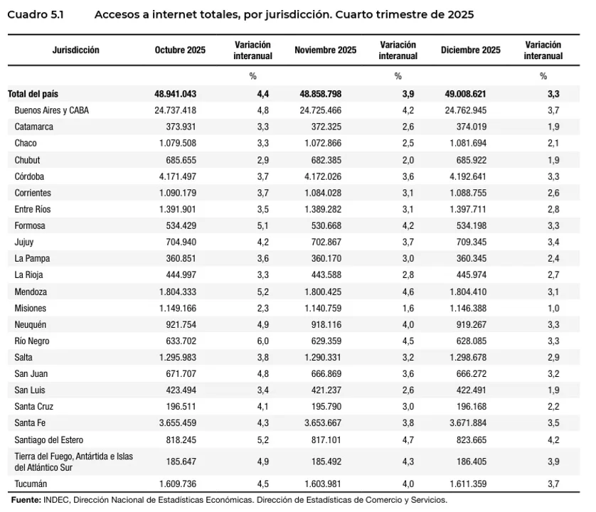 Este balance positivo pertenece específicamente al cuarto trimestre de 2025, periodo en el que se registraron promedios mensuales de 8.516.515 accesos a internet fijo. Según Noticias Argentinas, este volumen representa un incremento del 4,1% en comparación con el mismo periodo de 2024. El organismo estatal destacó que la suba se mantuvo constante durante los meses de octubre, noviembre y diciembre, con variaciones interanuales del 4,0%, 4,2% y 4,1% respectivamente, lo que demuestra una estabilidad en la expansión de la infraestructura digital.