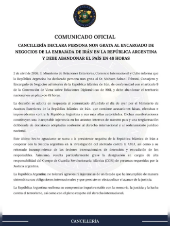 Irán aún no emitió una respuesta oficial a la expulsión, pero se espera que Teherán adopte medidas de represalia en las próximas horas, que podrían incluir la declaración de persona no grata a algún funcionario argentino en territorio iraní.