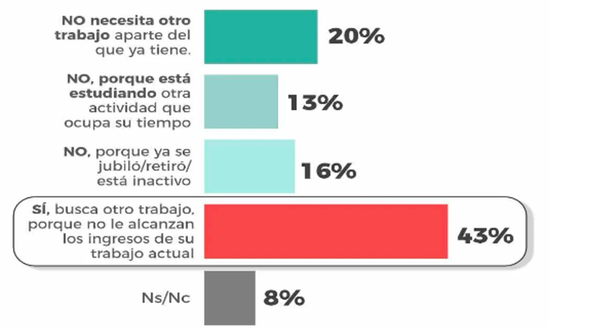 La encuesta consultó a argentinos mayores de 18 años (más de 3.000) si están buscando trabajo y un 43% respondió afirmativamente , pero no porque no tienen trabajo, sino porque no les alcanzan los ingresos de su trabajo actual.