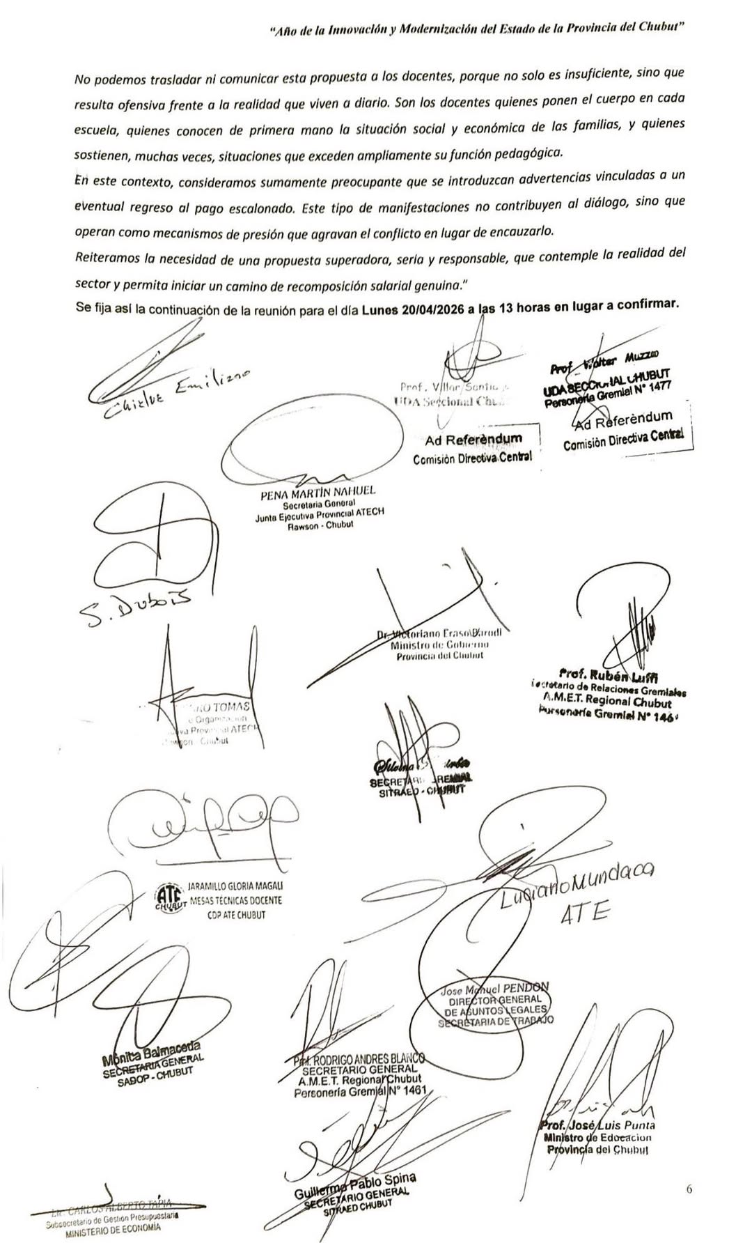 Luego de analizar la propuesta elevada por los Ministerios de Educación y Economía, el gremio docente resolvió rechazarla “de manera categórica por considerarla insuficiente ante la realidad económica que atraviesan los trabajadores y trabajadoras de la educación y el atraso salarial”.