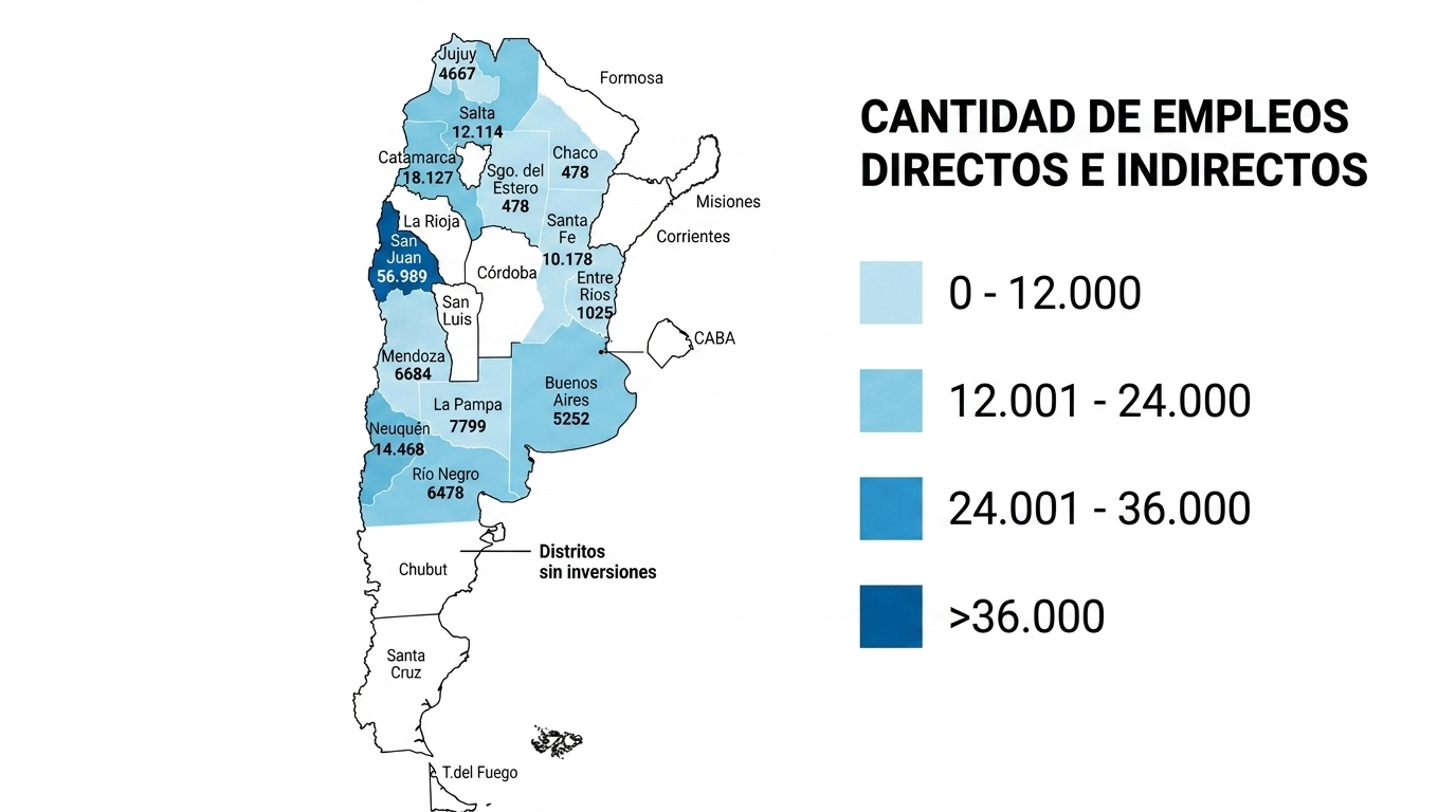 El ranking del RIGI está encabezado por provincias con fuerte desarrollo en recursos naturales. San Juan lidera con más de 56.000 empleos proyectados, seguido por Catamarca y Neuquén, mientras que otras jurisdicciones como Río Negro, Salta y Mendoza también concentran gran parte de las inversiones.
