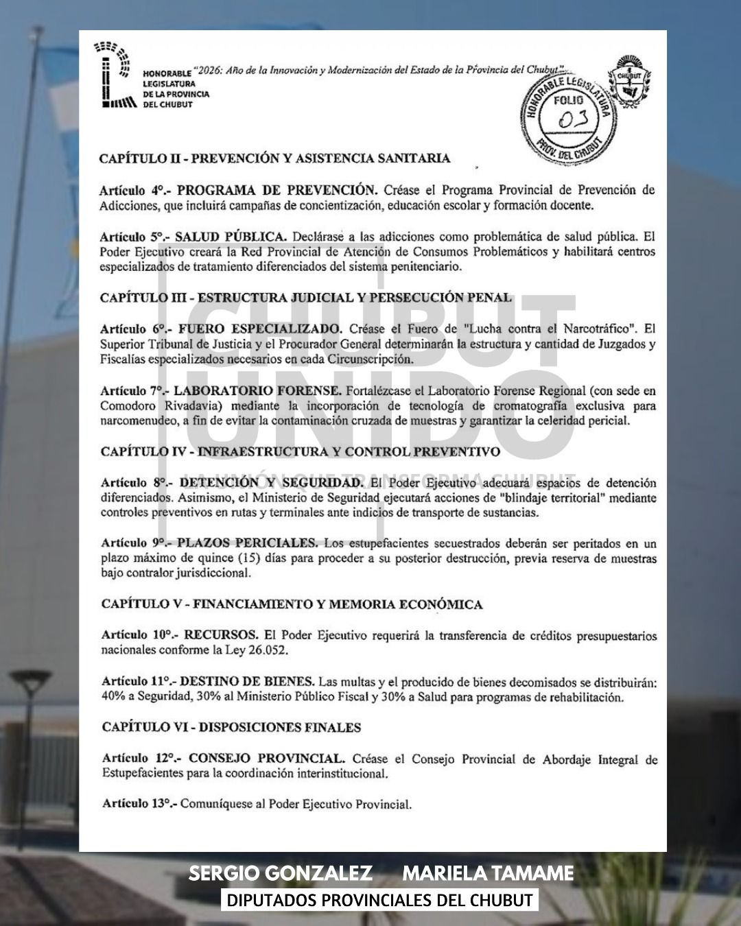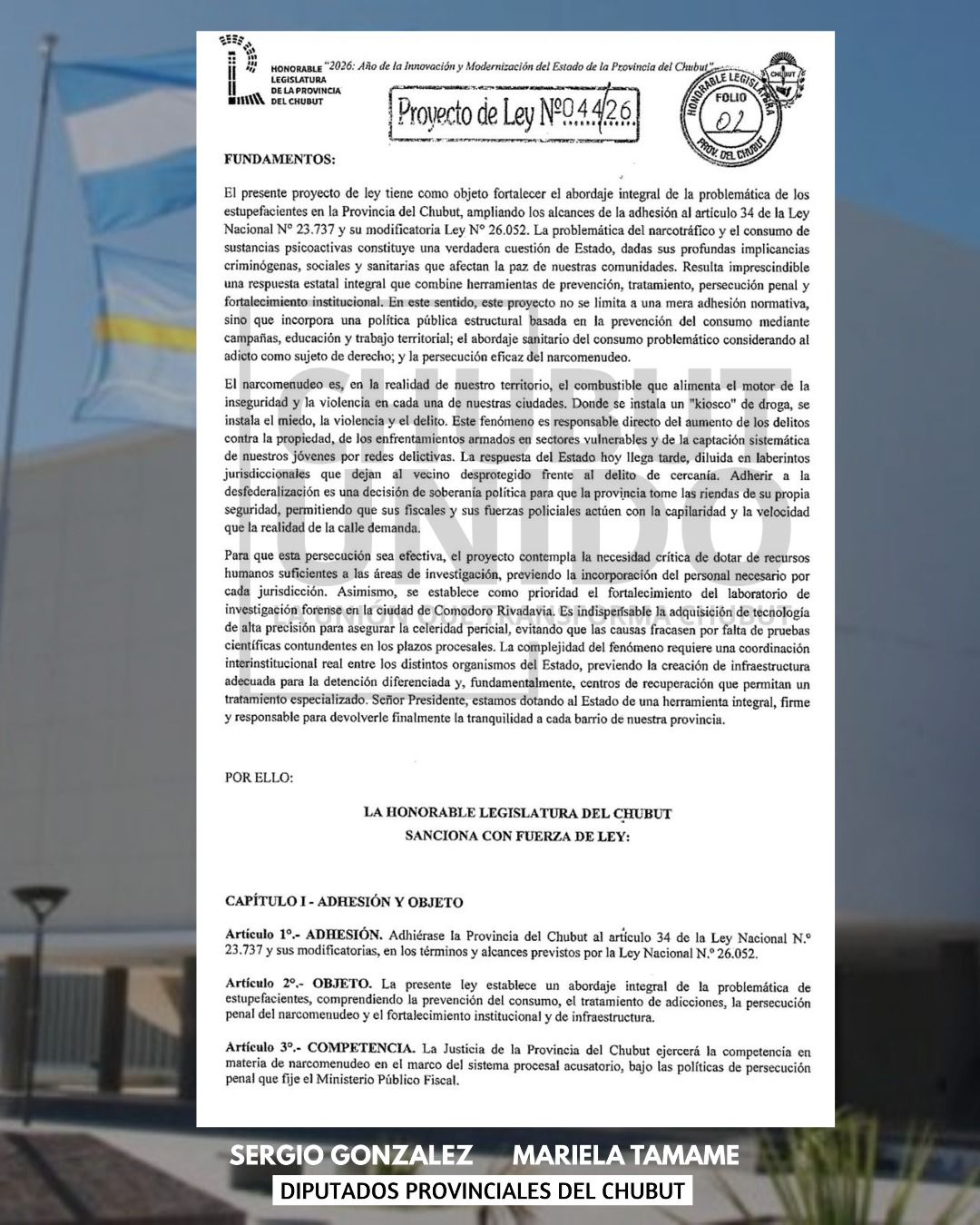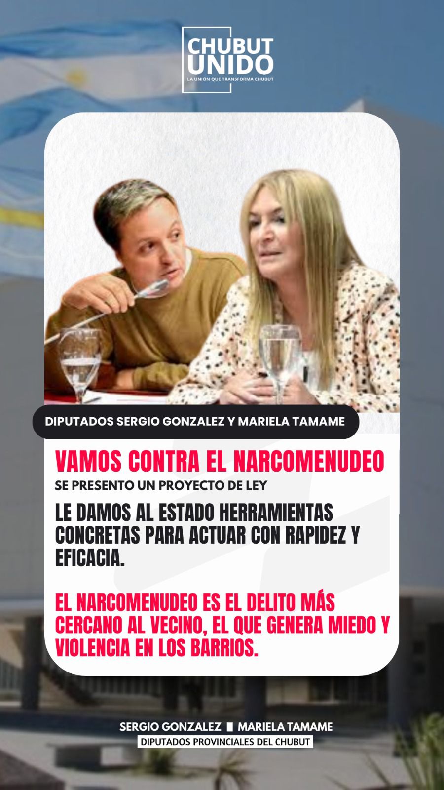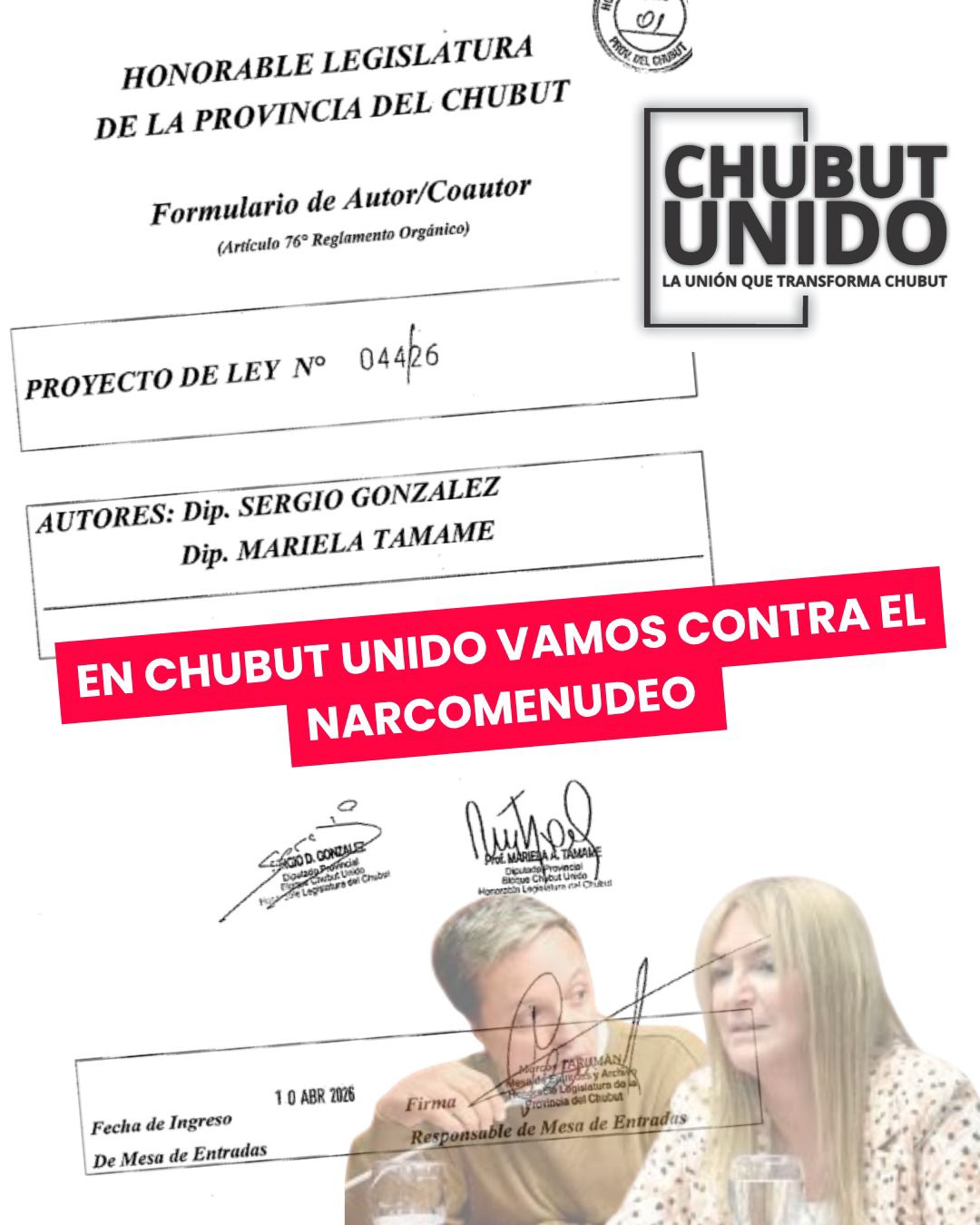 En un contexto de creciente preocupación por la seguridad en los barrios, el bloque Chubut Unido dio un paso decisivo en la Legislatura Provincial. Los diputados Sergio González y Mariela Tamame presentaron este 10 de abril un proyecto de ley que busca dotar al Estado de «herramientas concretas para actuar con rapidez y eficacia» contra el narcomenudeo.