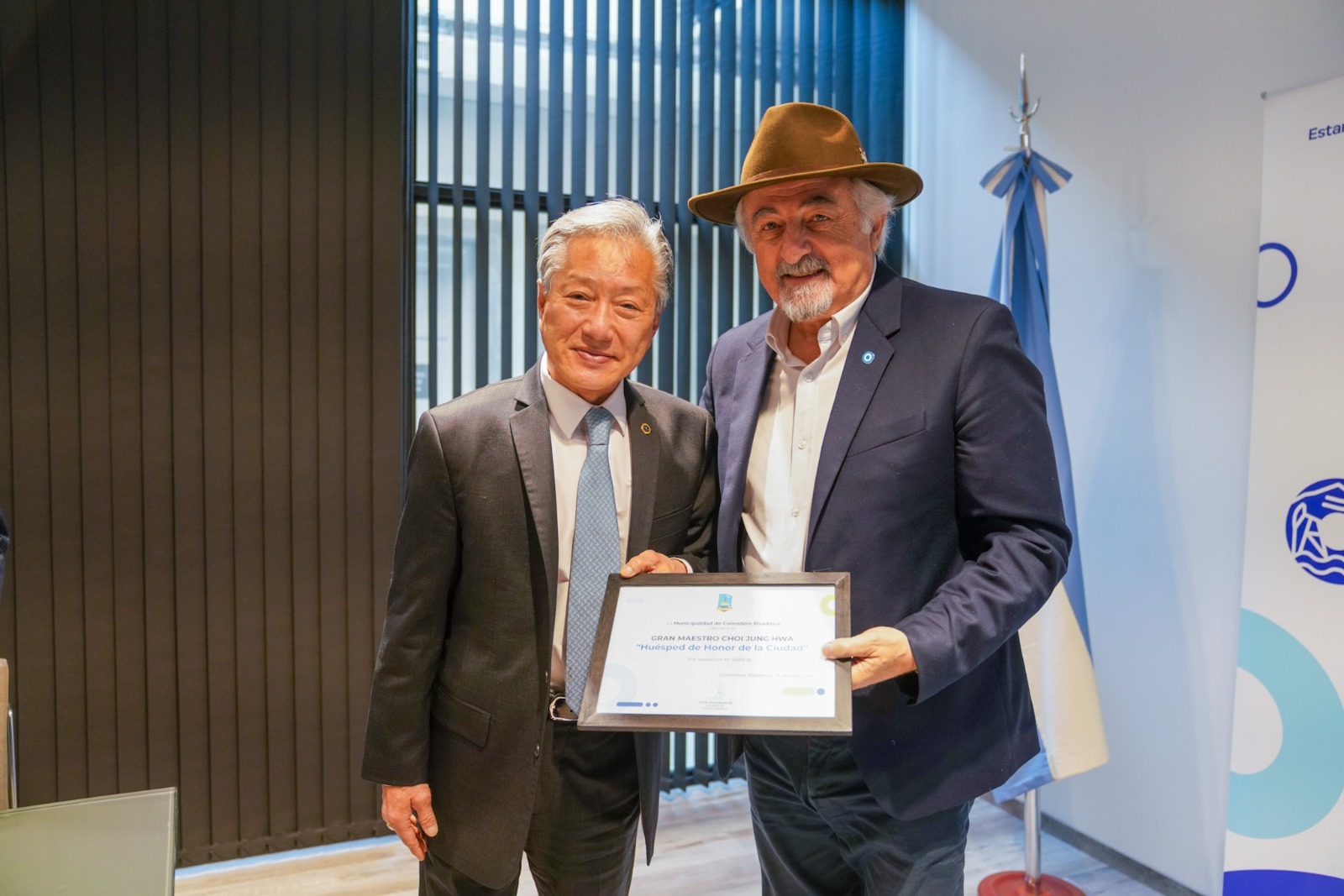 El intendente de Comodoro Rivadavia, Othar Macharashvili, recibió en su despacho al Gran Máster Choi Jung Hwa, referente internacional del taekwondo e hijo del creador de la disciplina, en el marco de su visita a la ciudad donde brindará una masterclass destinada a deportistas de la ciudad