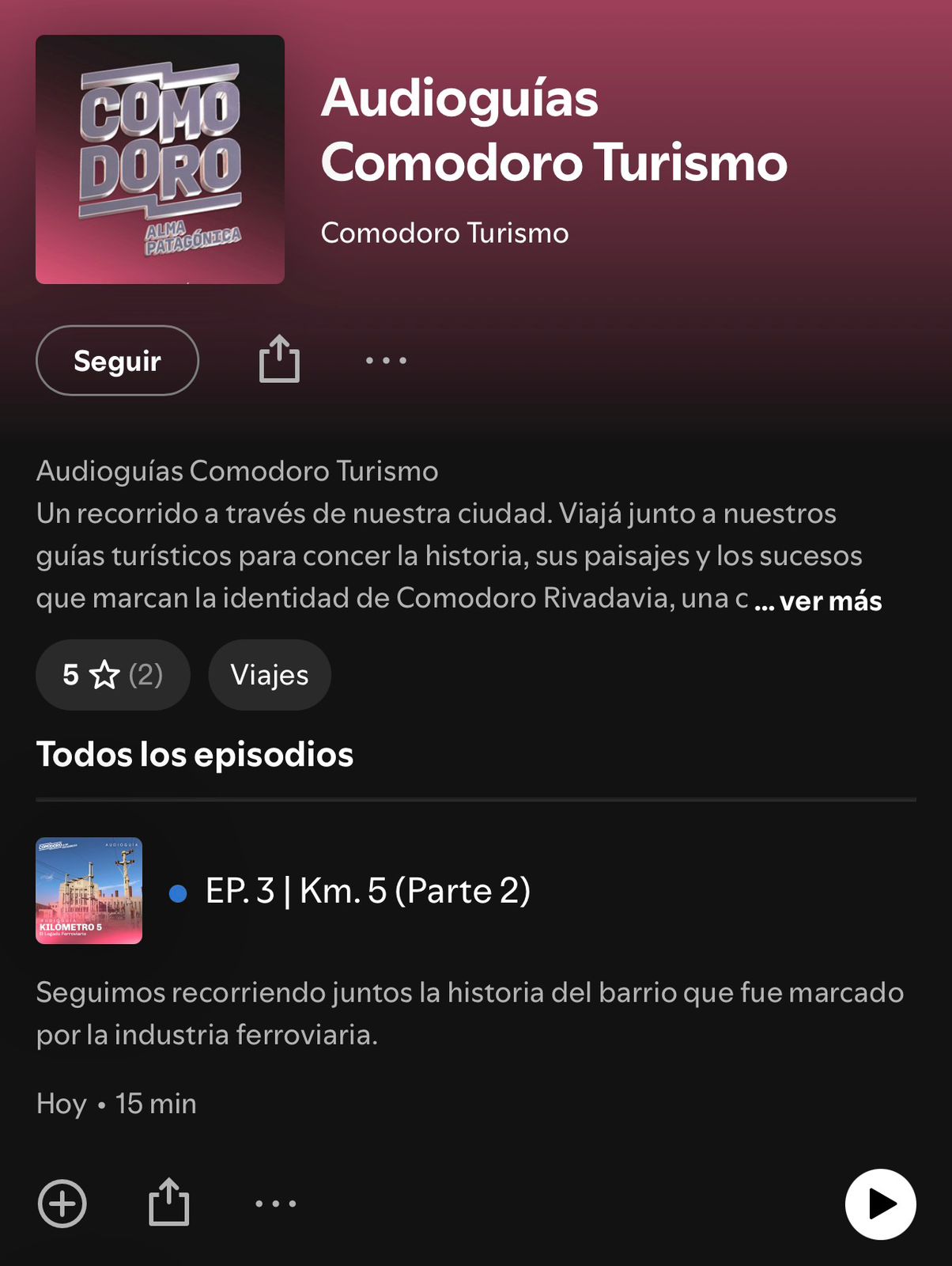 Las primeras tres ediciones, Centro, Km3 y Km5, ya se encuentran disponibles en la plataforma Spotify como “Audioguías Comodoro Turismo”