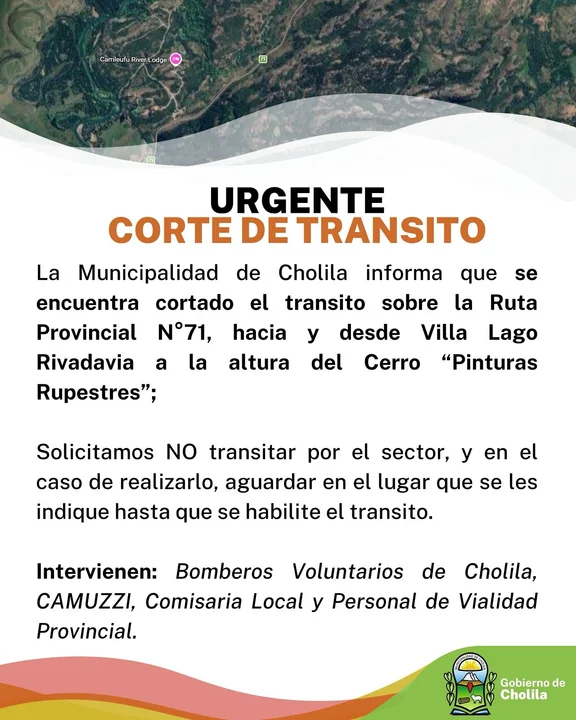 La Municipalidad de Cholila solicita circular con responsabilidad y mantenerse informados por los canales oficiales. Se recomienda NO transitar por el sector. En caso de hacerlo, respetar las indicaciones del personal y aguardar hasta la habilitación del tránsito.