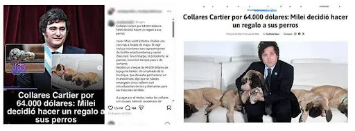Otra invención apuntó a la excentricidad del presidente. Los archivos indican la orden de “inyectar una noticia sobre Milei comprando 5 collares para perros de Cartier por valor de US$ 64 mil en EE.UU.”, replicada en redes y foros del exterior.