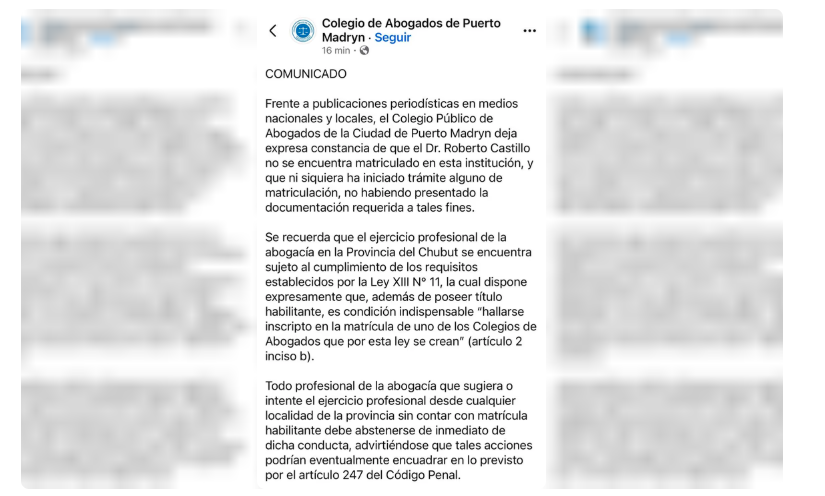 En un giro inesperado para la opinión pública y los medios nacionales, el Colegio de Abogados de Puerto Madryn salió al cruce de las versiones que indicaban la matriculación del abogado Roberto Castillo. Este miércoles 15 de abril de 2026, la institución desmintió categóricamente que el letrado haya iniciado trámites o mantenido contacto alguno con la entidad profesional.