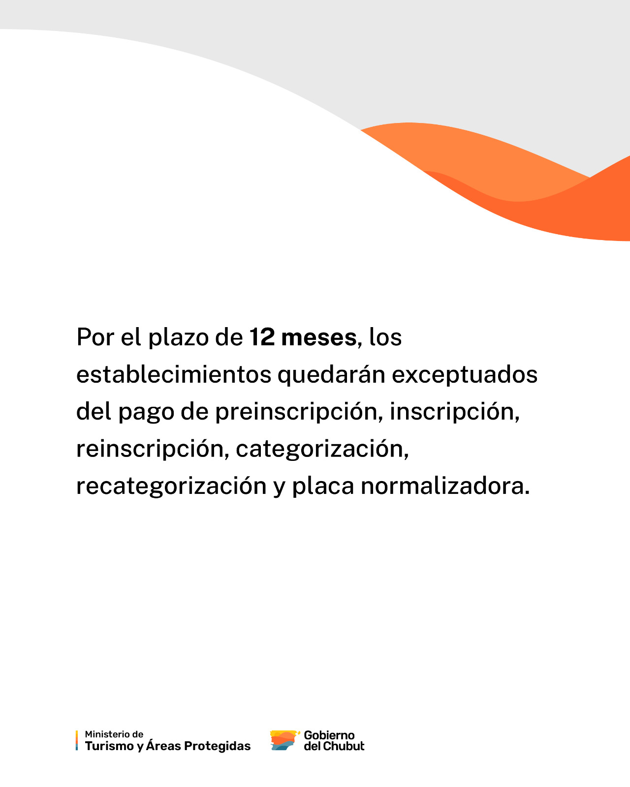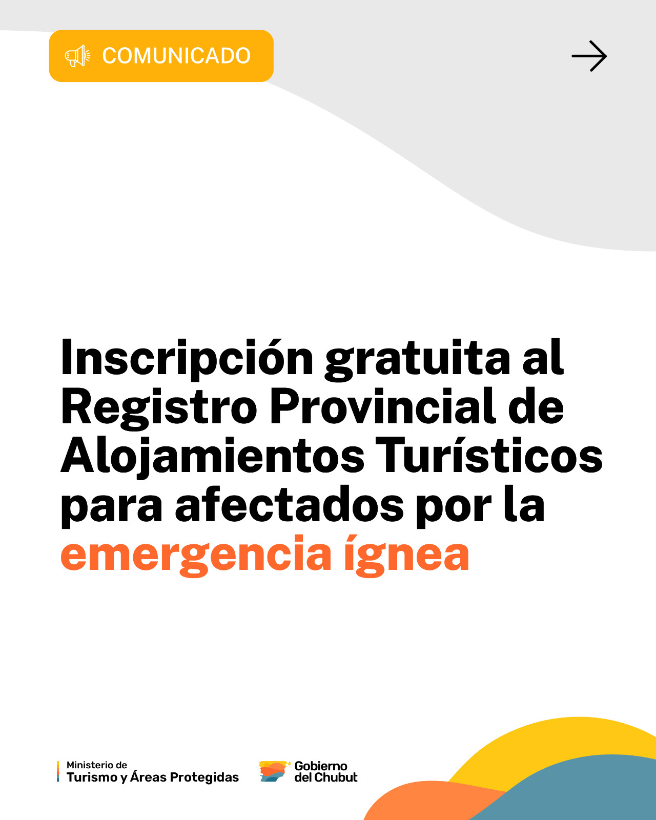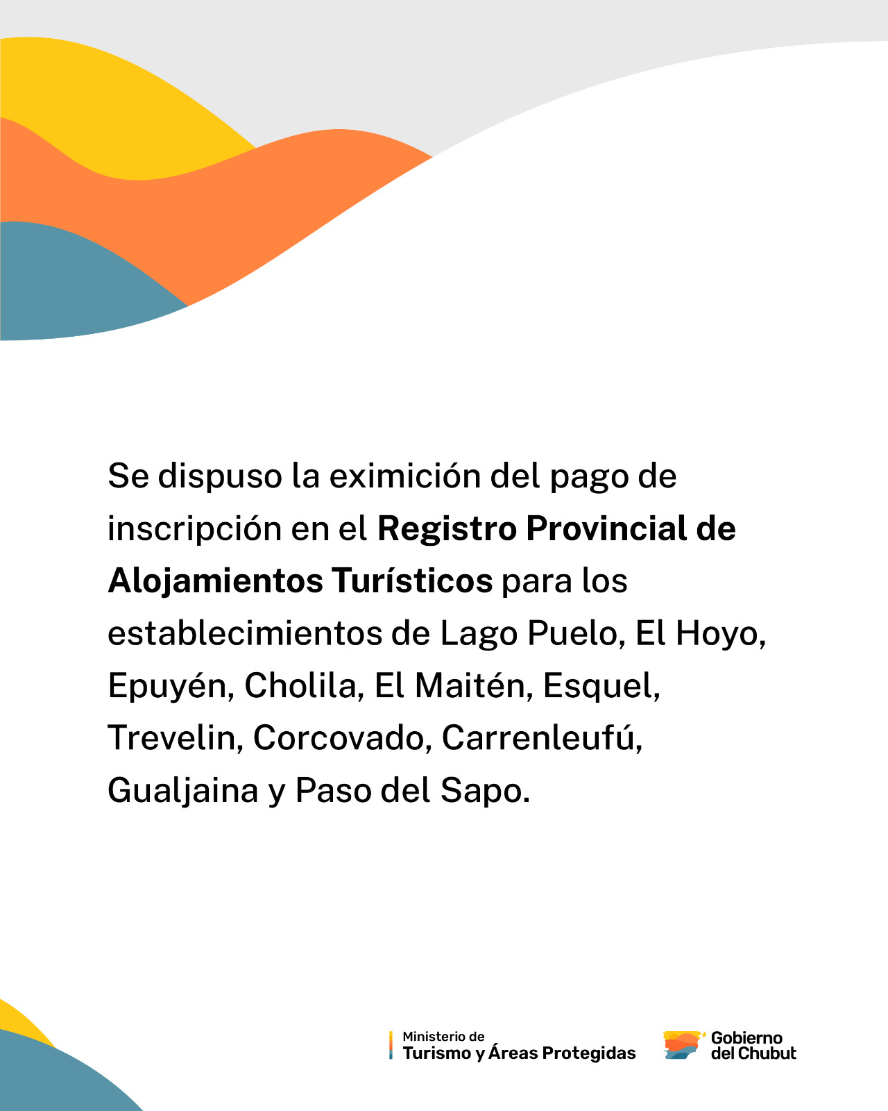 El Gobierno del Chubut, por intermedio del Ministerio de Turismo y Áreas Protegidas, dispuso la eximición del pago de inscripción en el Registro Provincial de Alojamientos Turísticos para los establecimientos ubicados en las localidades de Lago Puelo, El Hoyo, Epuyén, Cholila, El Maitén, Esquel, Trevelin, Corcovado, Carrenleufú, Gualjaina y Paso del Sapo.