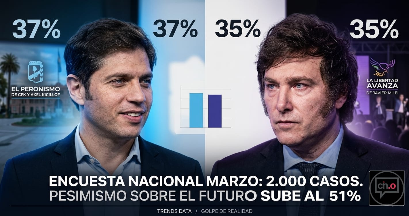 Tras un inicio de gestión marcado por la polarización, marzo parece haber sido el mes del quiebre: la intención de voto por espacio ya pone al peronismo (37%) por encima de La Libertad Avanza (35%) de cara a las presidenciales de 2027.