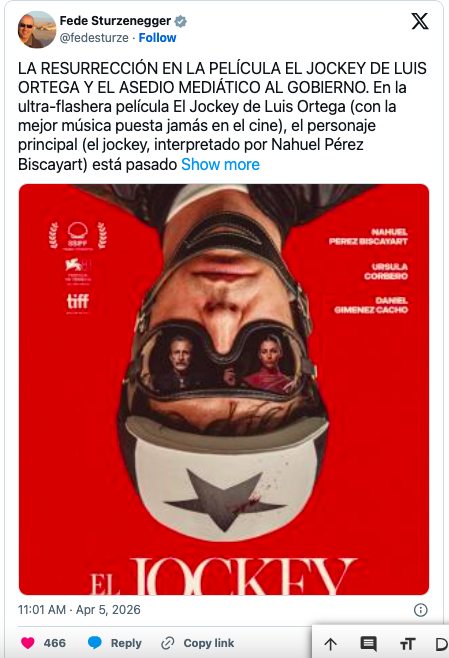 En una de sus habituales y extensas publicaciones en la red social X, el ministro de Modernización, Federico Sturzenegger, sorprendió este domingo 5 de abril de 2026 al utilizar el cine nacional como herramienta de análisis político. Bajo el título «La resurrección en la película El Jockey de Luis Ortega y el asedio mediático al Gobierno», el funcionario trazó un paralelismo entre el film «ultra-flashero» y el proceso de transformación que, según su visión, atraviesa la Argentina de Javier Milei.