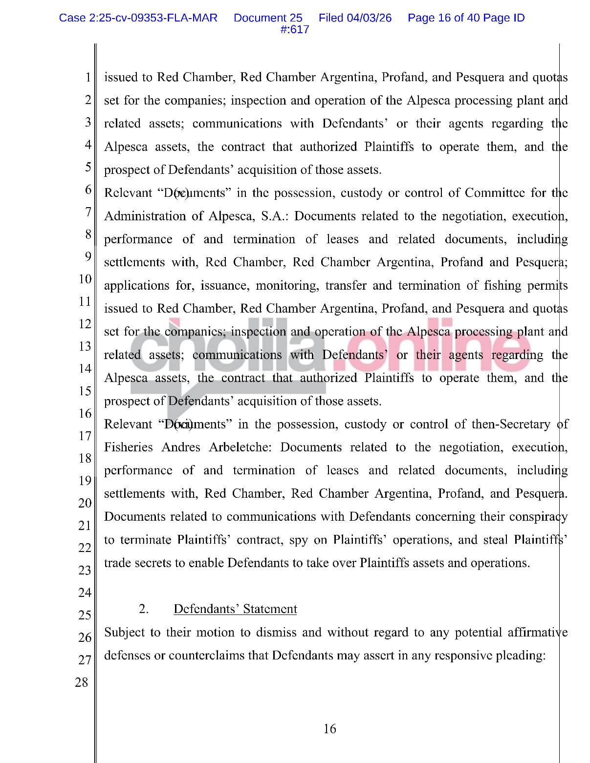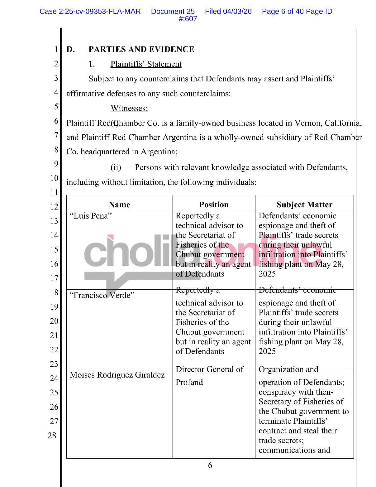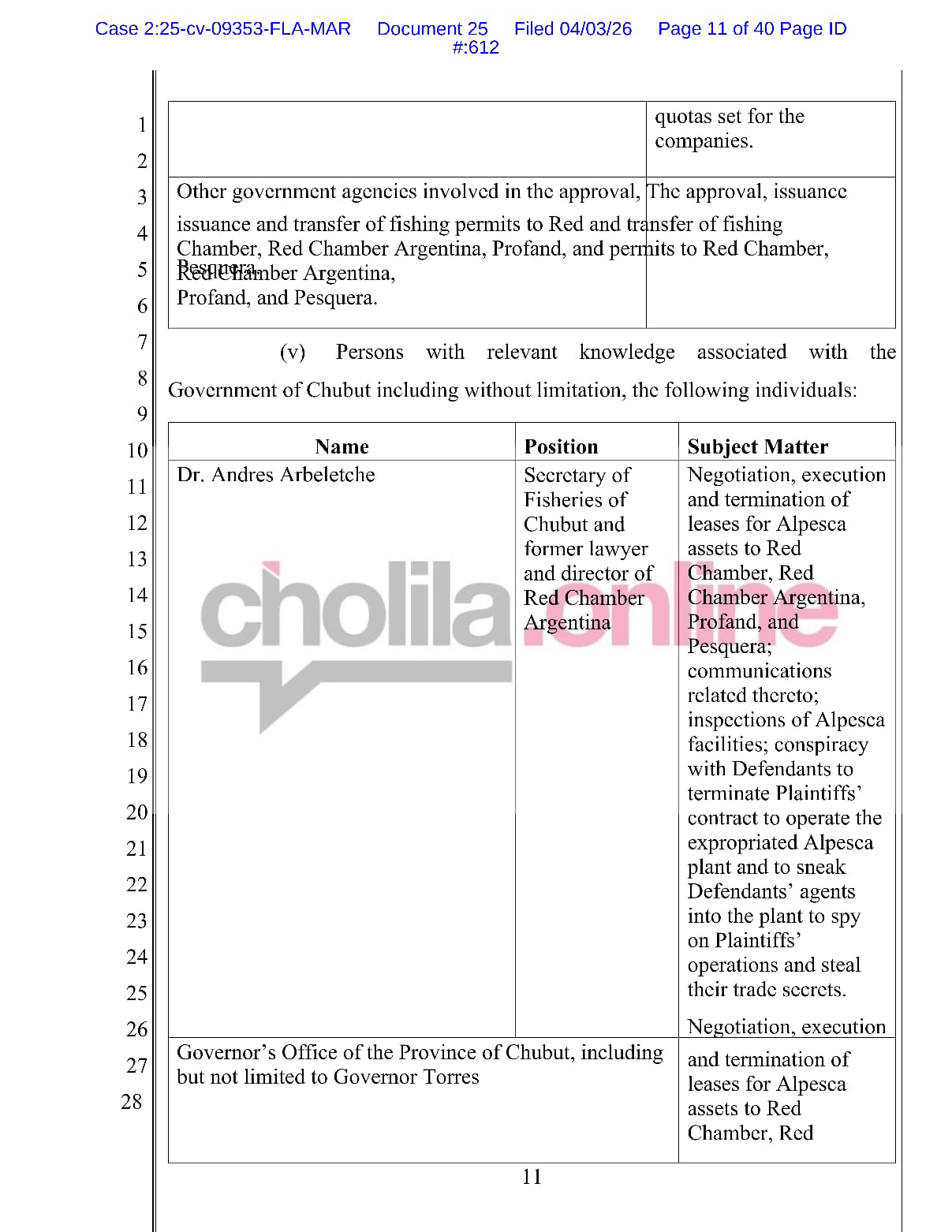 Según el reporte conjunto presentado ante el Juez Fernando L. Aenlle-Rocha, Red Chamber Argentina alega haber sido víctima de una maniobra orquestada entre el Gobierno del Chubut y el holding español Grupo Profand. La demanda sostiene que el entonces Secretario de Pesca de la provincia —identificado en el documento como el Dr. Andrés Arbeletche— habría conspirado para finalizar de forma abrupta el contrato que permitía a Red Chamber operar la planta expropiada de Alpesca.