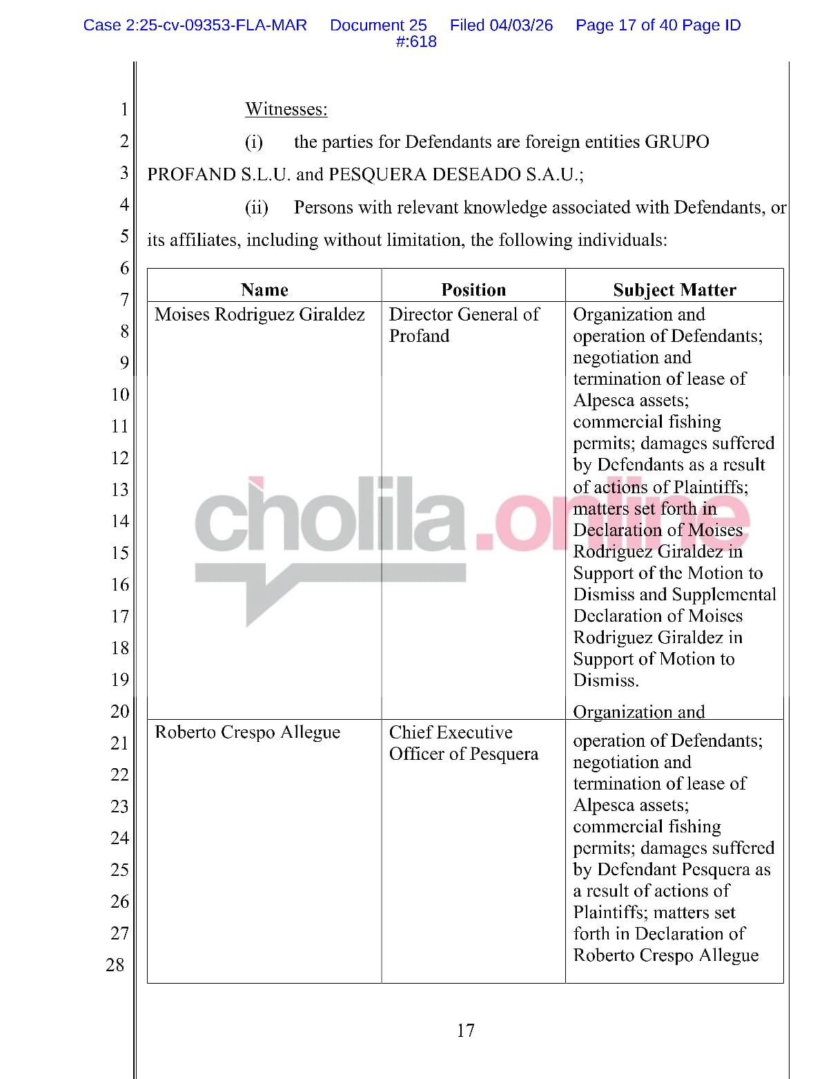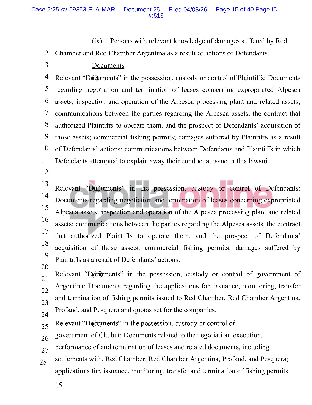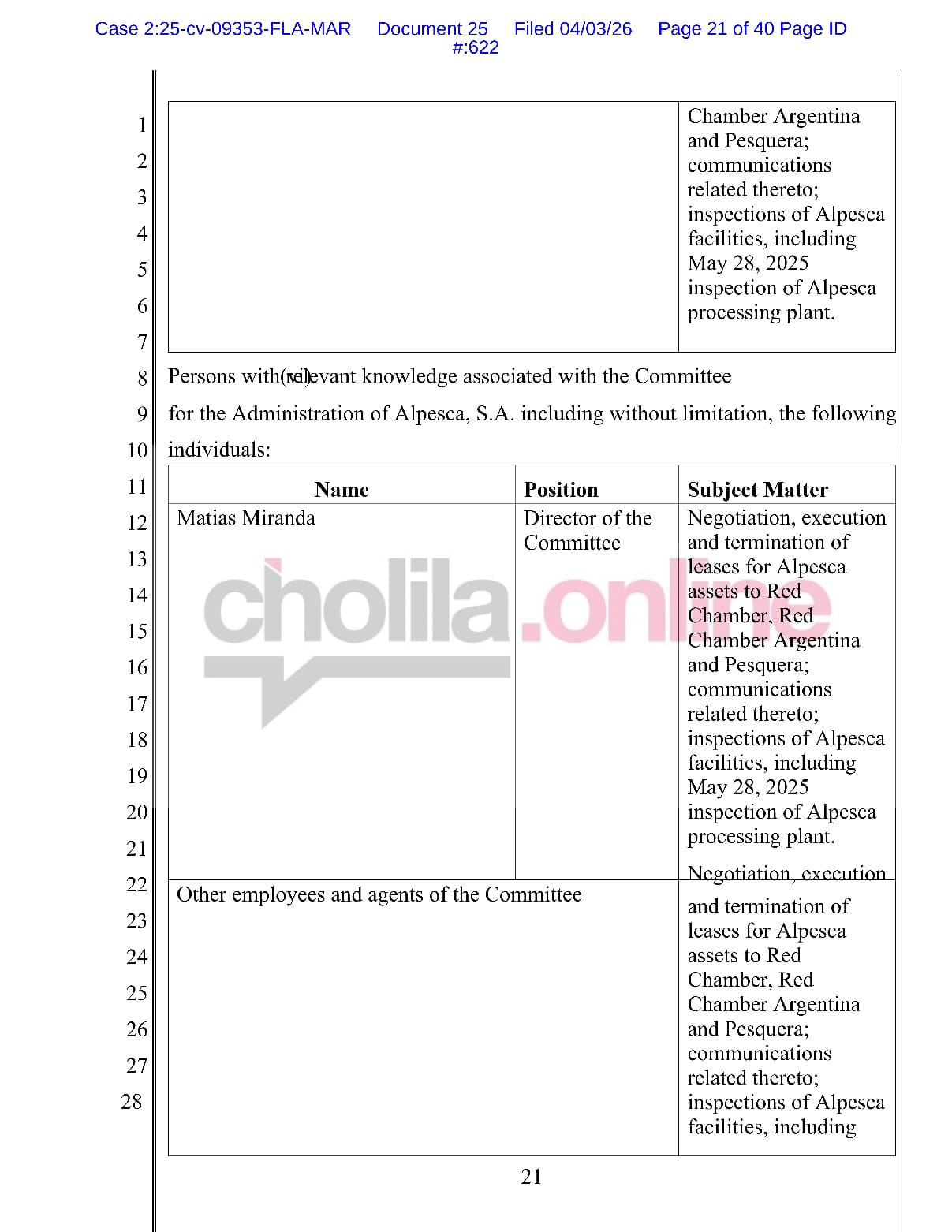 La justicia estadounidense no solo pone el foco en los mandos medios. La demanda incluye entre las personas con conocimiento relevante de estos hechos a la propia Oficina del Gobernador, mencionando explícitamente a Ignacio Torres en relación con las decisiones oficiales, comunicaciones y órdenes que derivaron en la terminación del contrato con Red Chamber para beneficiar supuestamente a Profand y Pesquera Deseado.