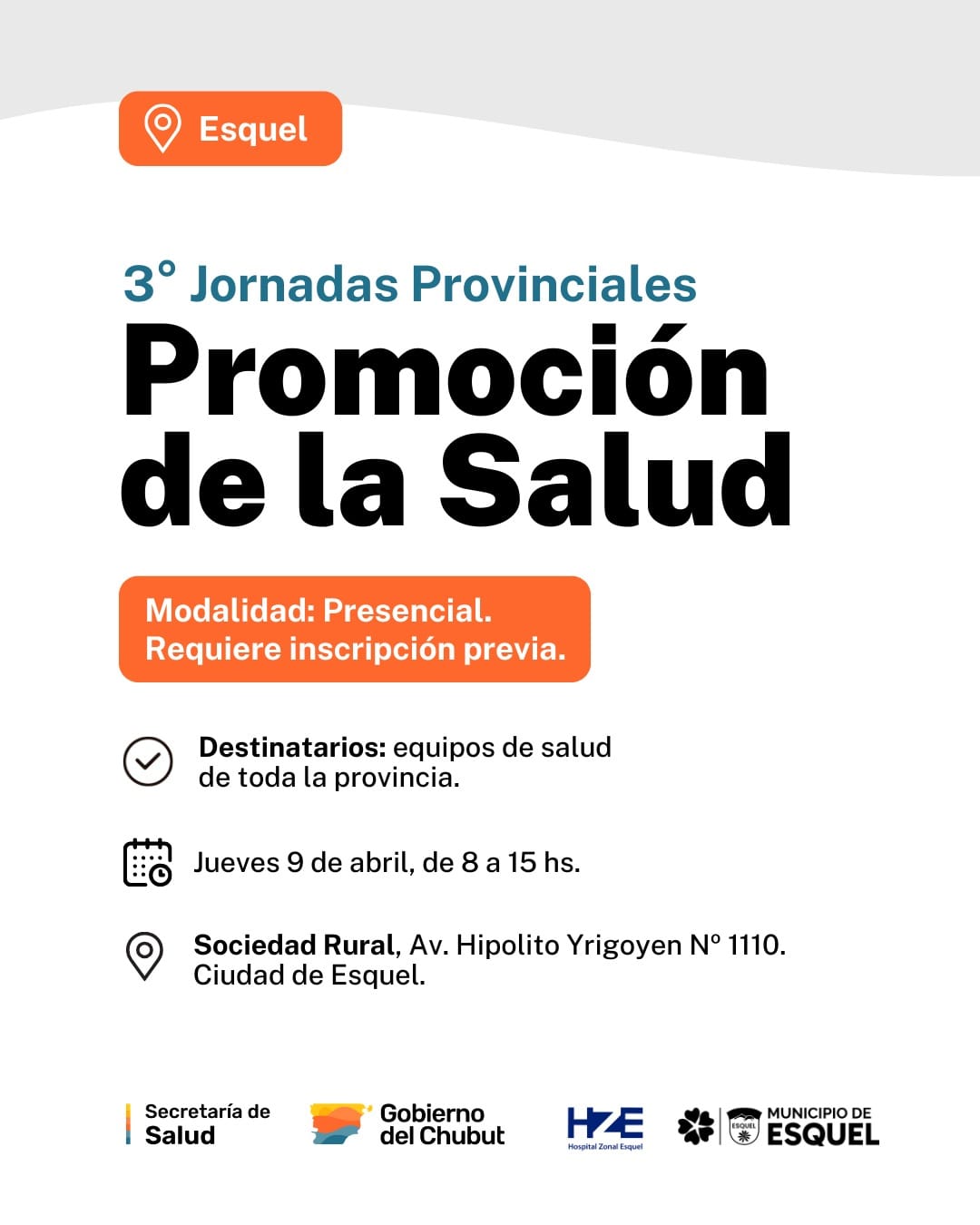 La 9° edición de la “Jornada Provincial de Trabajadores Comunitarios de Salud en Terreno” se desarrollará los días martes 7 y miércoles 8 de abril, en la Sociedad Rural de Esquel, de 8 a 15 horas, bajo el lema “Potenciando el Rol de los y las Trabajadores/as Comunitarios/as de Salud en Terreno que la comunidad necesita”.