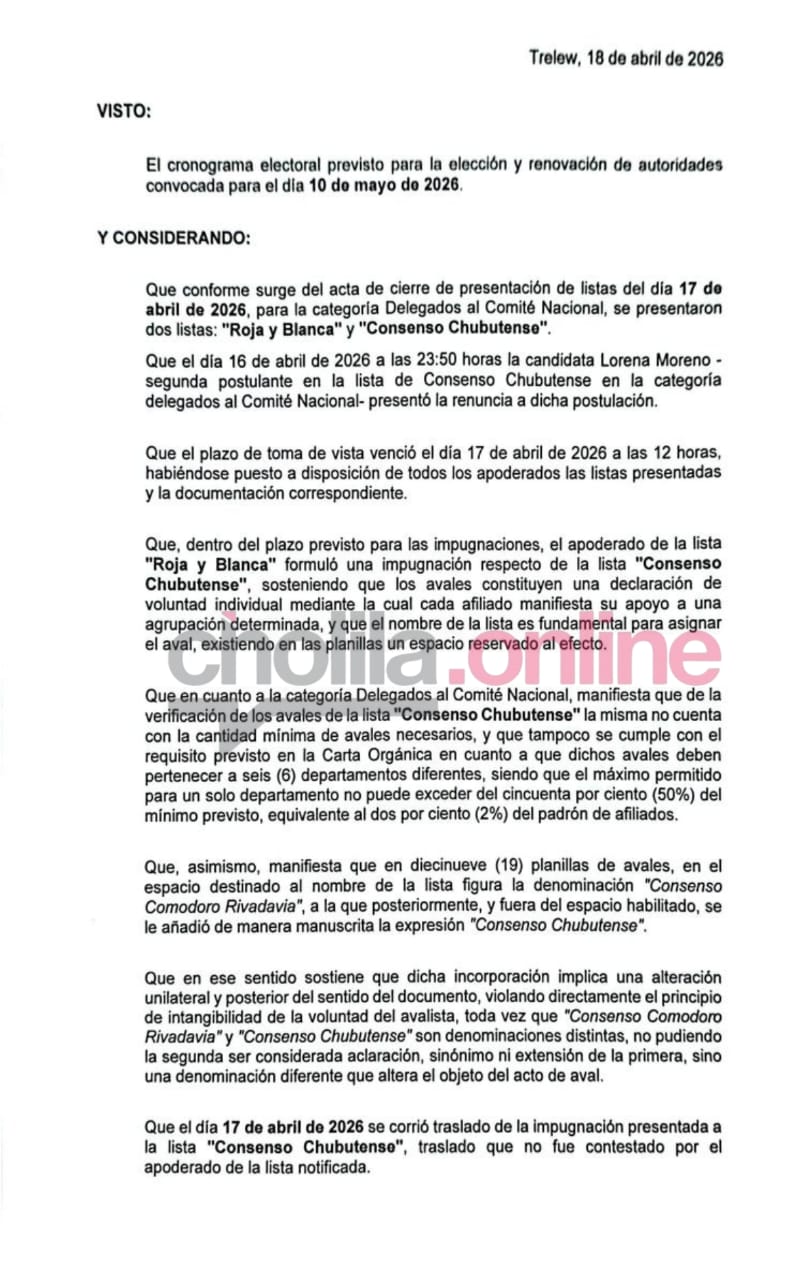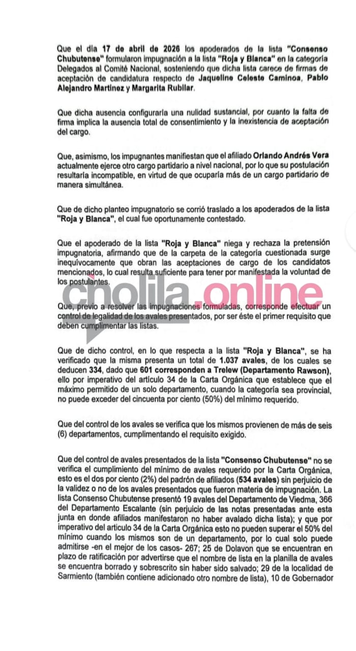 ​La jornada estuvo marcada por una fuerte disputa legal. «Consenso Chubutense» había intentado impugnar a candidatos de la «Roja y Blanca» —como Jaqueline Caminoa y Pablo Martínez— alegando falta de firmas de aceptación, pero la Junta desestimó el planteo al verificar que la documentación estaba en regla.