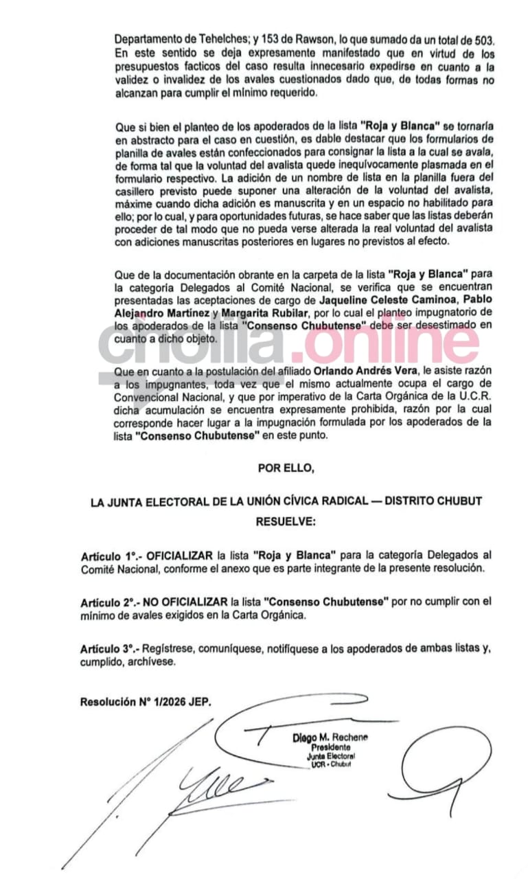 ​La Resolución N° 1/2026, firmada por el presidente de la Junta, Diego M. Rechene, detalló las irregularidades que derivaron en la exclusión de la lista opositora y resolvió las impugnaciones cruzadas presentadas por ambos sectores.