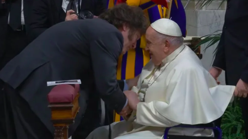 Milei había criticado en duros términos al papa Francisco antes de llegar a la Presidencia, pero tras asumir inició un camino de acercamiento que culminó el 12 de febrero de 2024 cuando concretaron una reunión extensa y amable en el Vaticano. La reunión fue una audiencia privada de aproximadamente 70 minutos en la biblioteca del Palacio Apostólico, considerada extensa para los protocolos vaticanos.