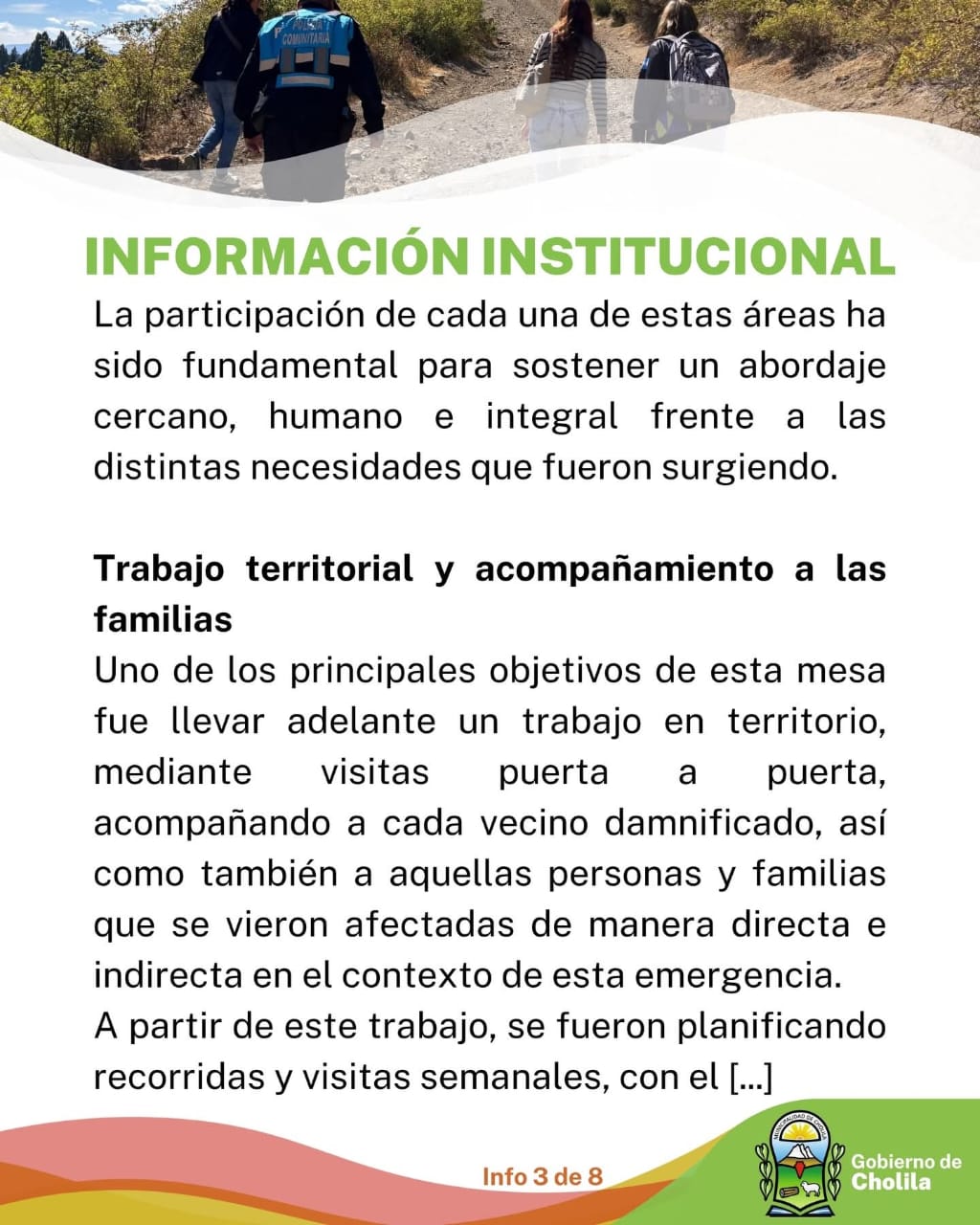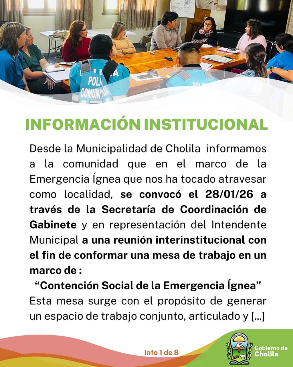 A través de una serie de ocho piezas gráficas informativas, el Ejecutivo Municipal expuso la conformación de una Mesa de Trabajo Interinstitucional, originalmente gestada bajo el marco de la «Emergencia Ígnea», pero que hoy ha volcado sus esfuerzos hacia la «Contención Social» y el acompañamiento integral de las familias.