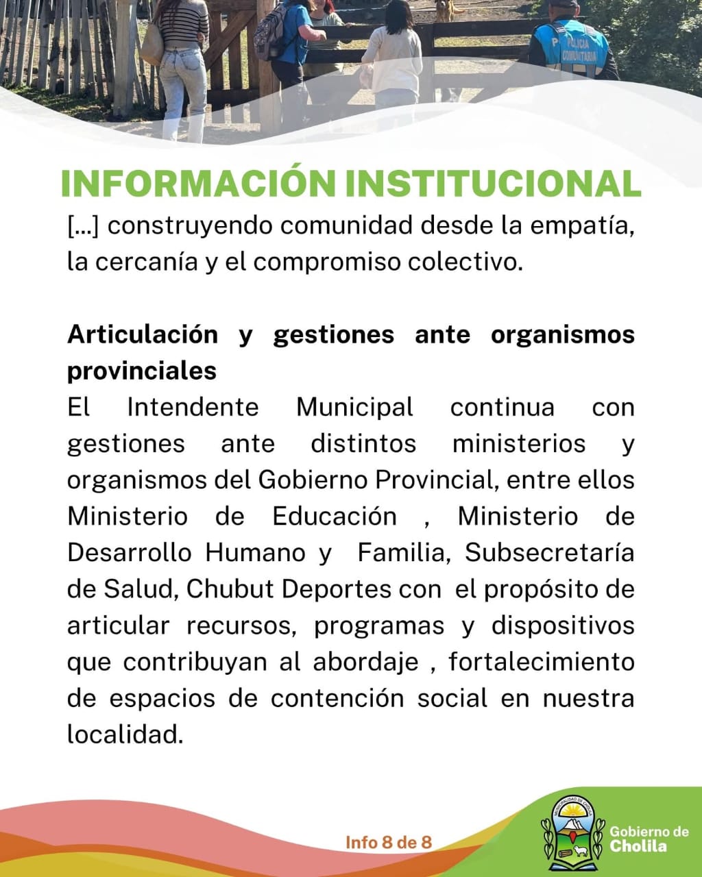 El informe institucional subraya que el Intendente Municipal mantiene gestiones activas ante diversos ministerios de la Provincia del Chubut, incluyendo las carteras de Educación, Desarrollo Humano y Familia, la Subsecretaría de Salud y Chubut Deportes. El fin de estas gestiones es la obtención de recursos y programas específicos que contribuyan a robustecer los dispositivos de contención social en la localidad.