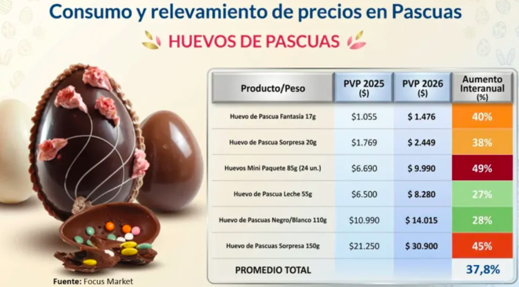 En cuanto al huevo de Pascua relleno, producto que cobró notoriedad durante la pandemia, escaló un 36% en la comparación año vs. año, de $22.000 a $29.900.