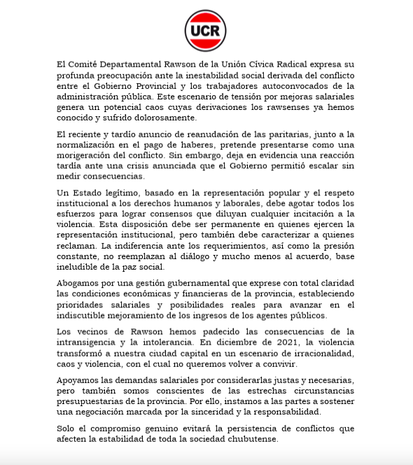 El Comité Departamental Rawson de la Unión Cívica Radical expresa su profunda preocupación ante la inestabilidad social derivada del conflicto entre el Gobierno Provincial y los trabajadores autoconvocados de la administración pública. Este escenario de tensión por mejoras salariales genera un potencial caos cuyas derivaciones los rawsenses ya hemos conocido y sufrido dolorosamente.