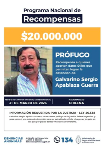 El Ministerio de Seguridad de la Nación ofrece 20 millones de pesos para quien aporte información sobre el paradero del ciudadano chileno Galvarino Apablaza, que cuenta con un pedido de captura nacional e internacional por homicidio y secuestro.