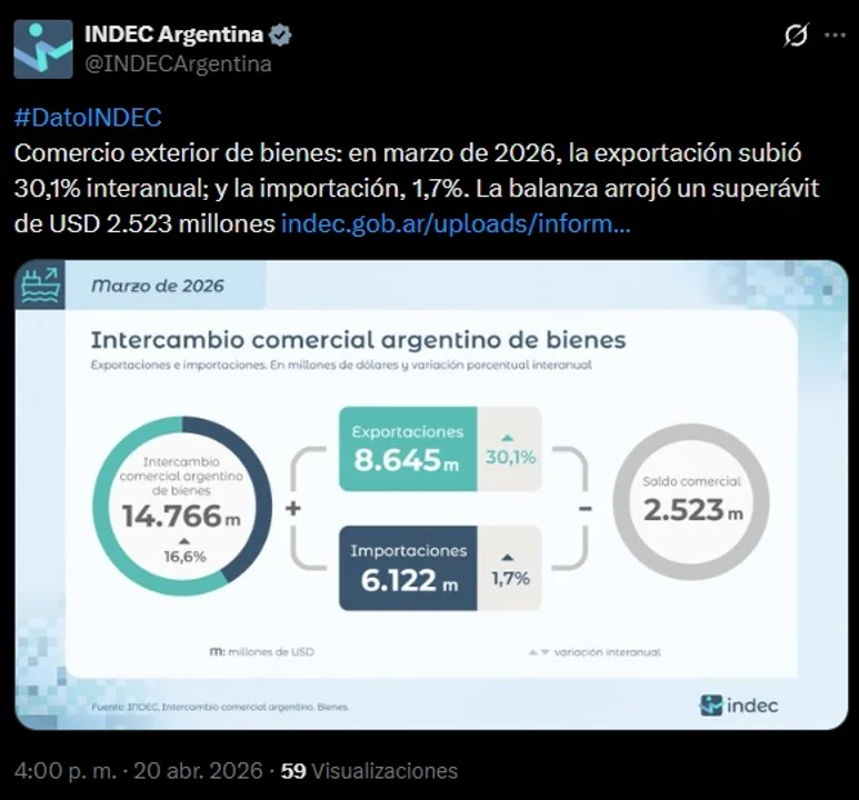 El INDEC informó un superávit récord de US$ 2.523 millones en la balanza comercial de marzo, con exportaciones históricas de US$ 8.645 millones. Es el 28° mes consecutivo con resultado positivo. Los productos primarios crecieron 56,2% y los combustibles y energías alcanzaron su valor más alto registrado.