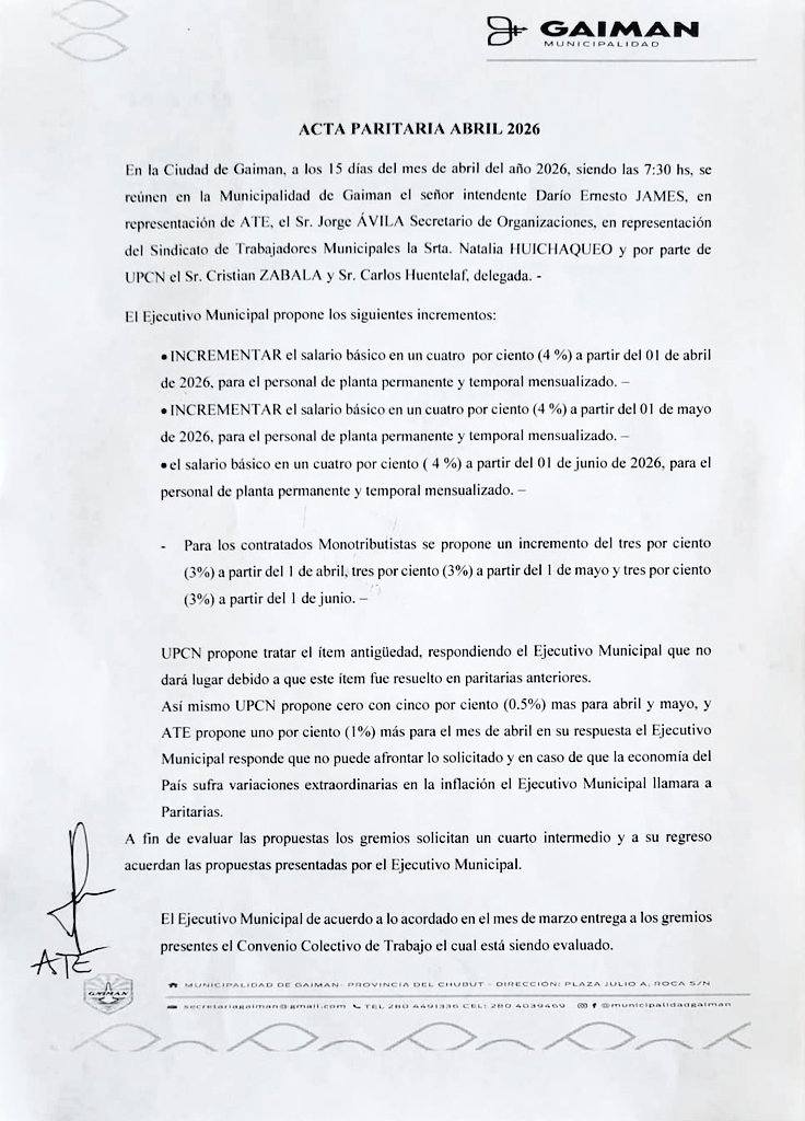 En un contexto económico marcado por la necesidad de proteger el poder adquisitivo, la UPCN Seccional Chubut informó este miércoles 15 de abril de 2026 la firma de un nuevo acuerdo salarial con la Municipalidad de Gaiman. La recomposición alcanza tanto al personal de planta como a los trabajadores contratados bajo la modalidad de monotributo.