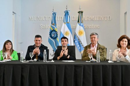 El intendente del Municipio de Sarmiento, Sebastián Balochi, junto a los representantes de Pan American Energy (PAE), el gerente de…